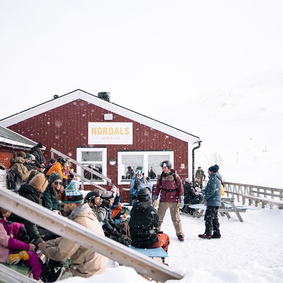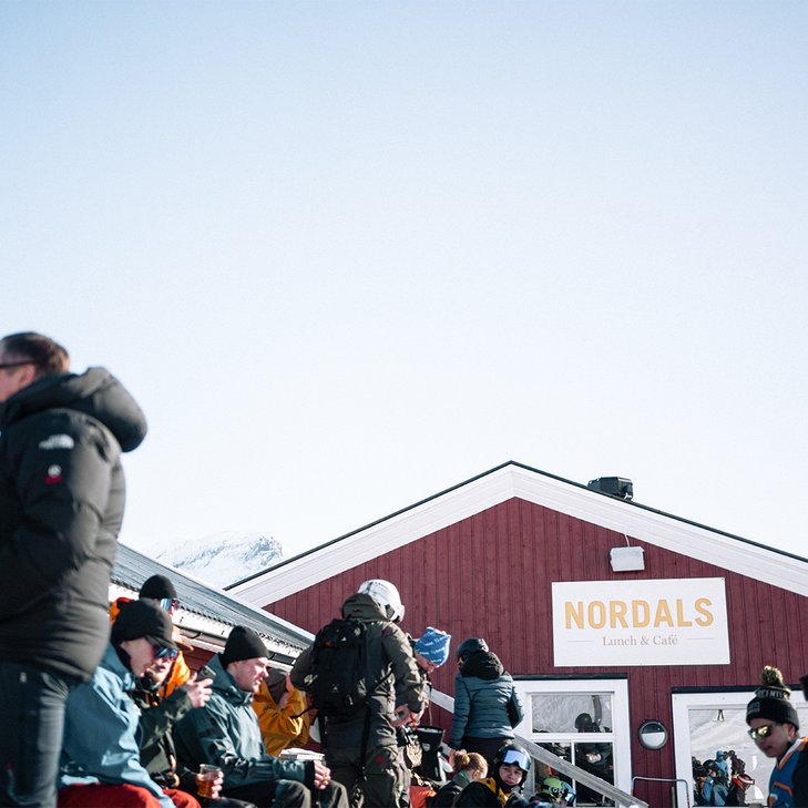 Do you want to warm up indoors or sunbathe with a view of the mountain? Then the foot of the Nordalsliften is the perfect place. With 60 seats indoors and a large outdoor veranda, there is always a seat for lunch or coffee at Nordals. If the weather gods are with us, food and drinks are also served outside on the veranda.