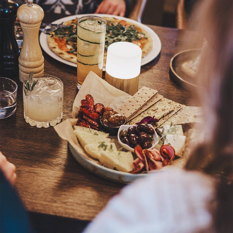 Vit bas, souvas (rökt renkött), mozzarella, basilika, lingon, svamp, västerbottensost och ruccola